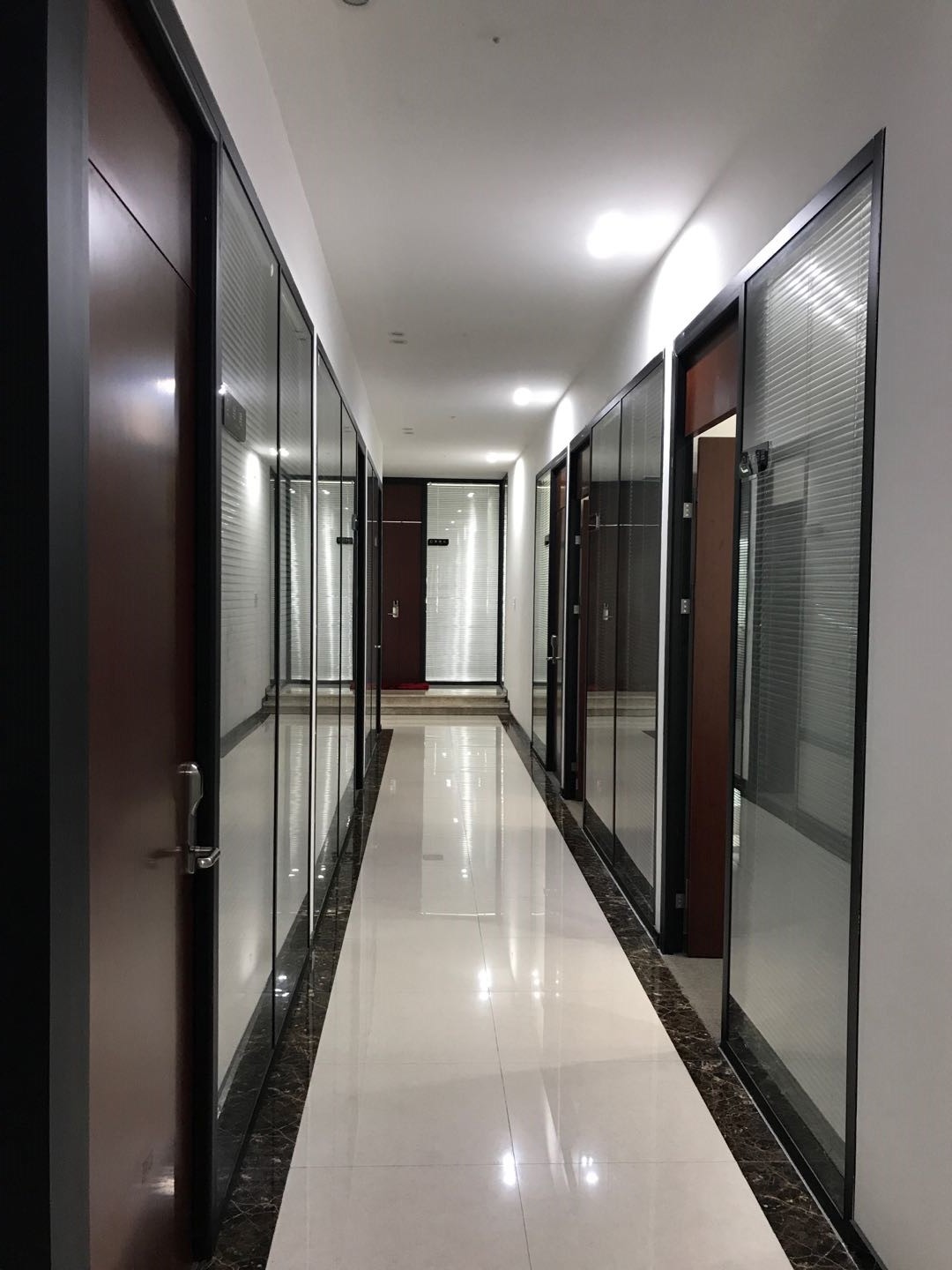 辦公室玻璃隔斷中的雙層玻璃內置百葉是由金屬外框架和雙層玻璃結構組成,百葉簾安裝在雙層玻璃中間,可手動調節光線,也可以加裝電機來實現智能控制。在會議洽談需要的時可進行調節以達到保護隱私的作用。在其它時間也可以根據個人喜好而調節采光,使辦公環境更明亮更通透。