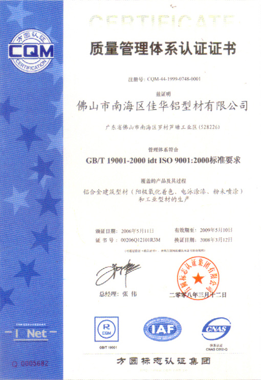 藝高斯隔斷質量管理體系證書